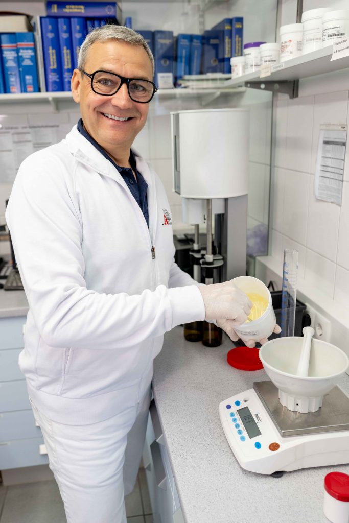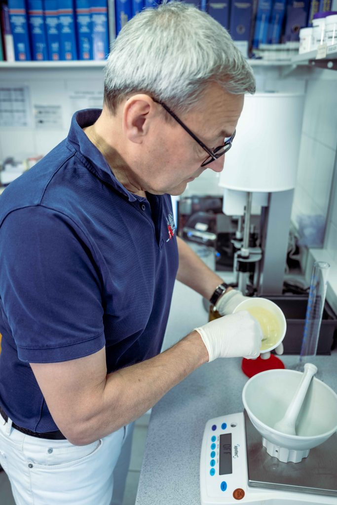 Jedes Jahr stellen Apotheken in Deutschland über 13 Millionen Rezepturarzneimittel her. Jeder Wirkstoff in unseren Labor wird auf Identität und Qualität geprüft. Auch die Herstellungsprozesse unterliegen strengen Vorschriften und werden sorgfältig dokumentiert, um höchste Sicherheit zu gewährleisten. Neben Rezepturarzneimitteln fertigen wir auch Defekturarzneimittel, die in kleinen Chargen ohne Zulassung hergestellt werden dürfen, jedoch ebenfalls den höchsten pharmazeutischen Standards entsprechen.