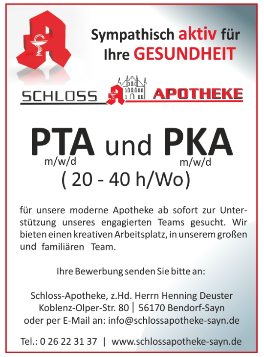 Für die Schloss Apotheke Sayn suchen wir aktuell Unterstützung für unser Team als Mitarbeiter/-in in Teilzeit